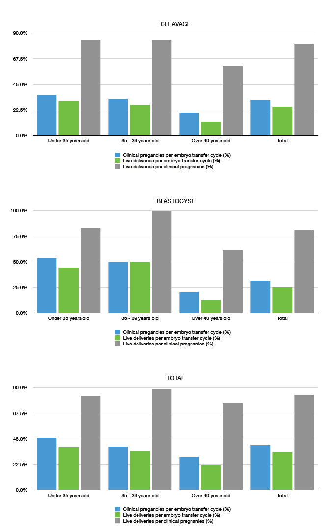 The following graphs show the rate of successful frozen embryo transfers for the clinical pregnancy and live birth rates per number of cycles of embryo transfer and number of pregnancies. This success rate fluctuates depending on the age group of the wife.