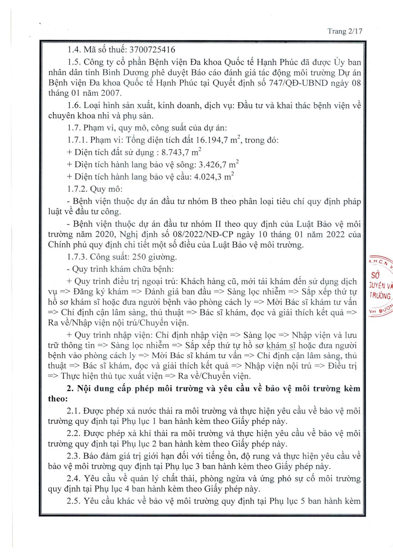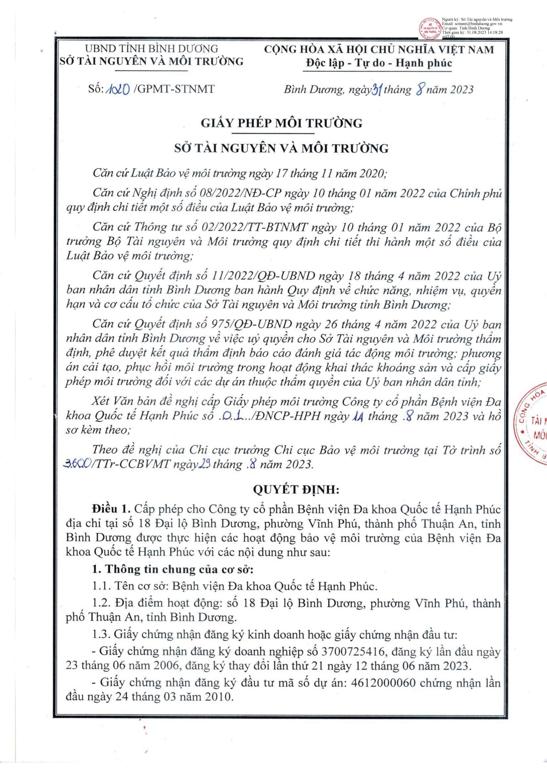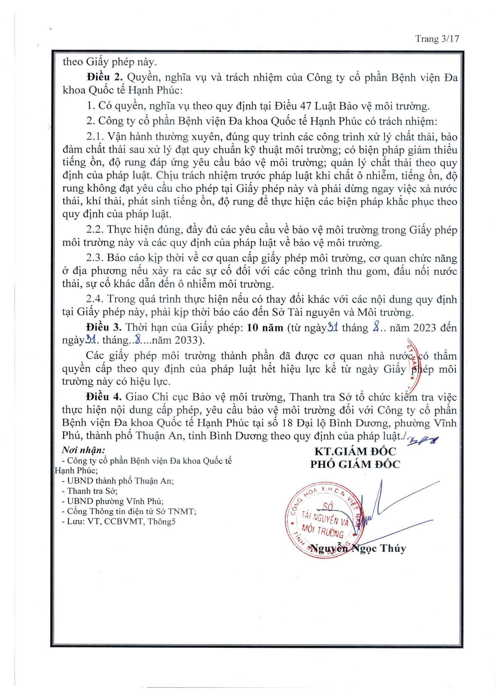 Với mong muốn mang đến môi trường chăm sóc sức khoẻ “xanh – sạch – đẹp”, Bệnh viện Quốc tế Hạnh Phúc tự hào được UBND Tỉnh Bình Dương – Sở Tài nguyên và Môi trường cấp phép môi trường nhằm thực hiện các hoạt động bảo vệ môi trường.